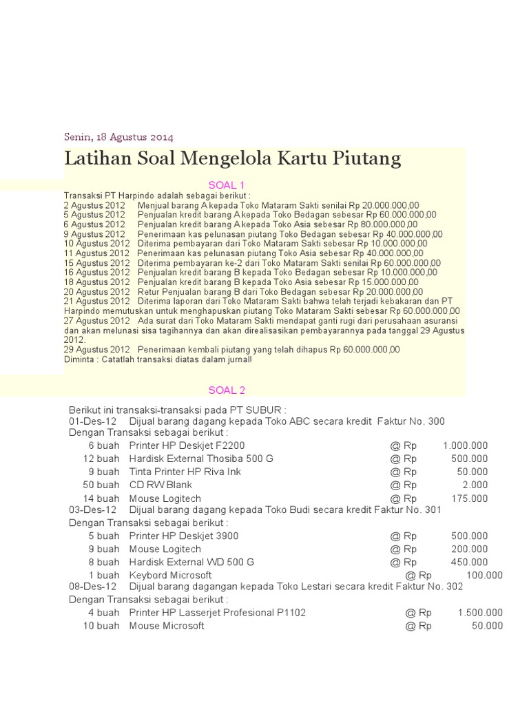 Contoh soal mengelola kartu piutang. We did not find results for: Check spelling or type a new query. Maybe you would like to learn more about one of these?