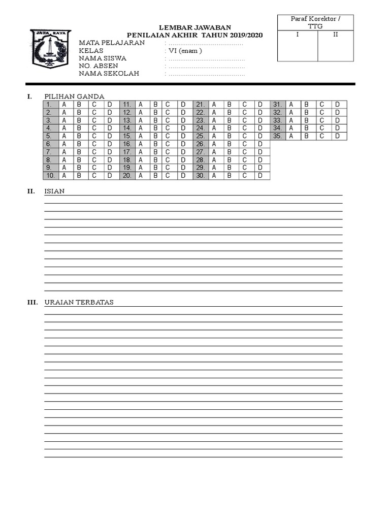 20200421 download soal dan pembahasan pkn ukk pat smp kelas 7 kurikulum 2013 ulangan kenaikan kelas ukk atau penilaian akhir tahun pat semester genap tahun pelajaran 20192020 akan terasa sangat. Pada postingan kali ini saya akan membagikan file lembar jawab k13 yang bisa digunakan untuk penilaian tengah semester pts penilaian akhir semeter pas dan penilaian akhir tahun pat khusunya untuk jenjang sekolah dasar sd. Berilah tanda silang (x) pada lembar jawaban a, b, c, d yang dianggap benar. Lembar jawaban komputer ljk dari mc excel 2007. Lembar jawab k13 pts/pas/pat sd.