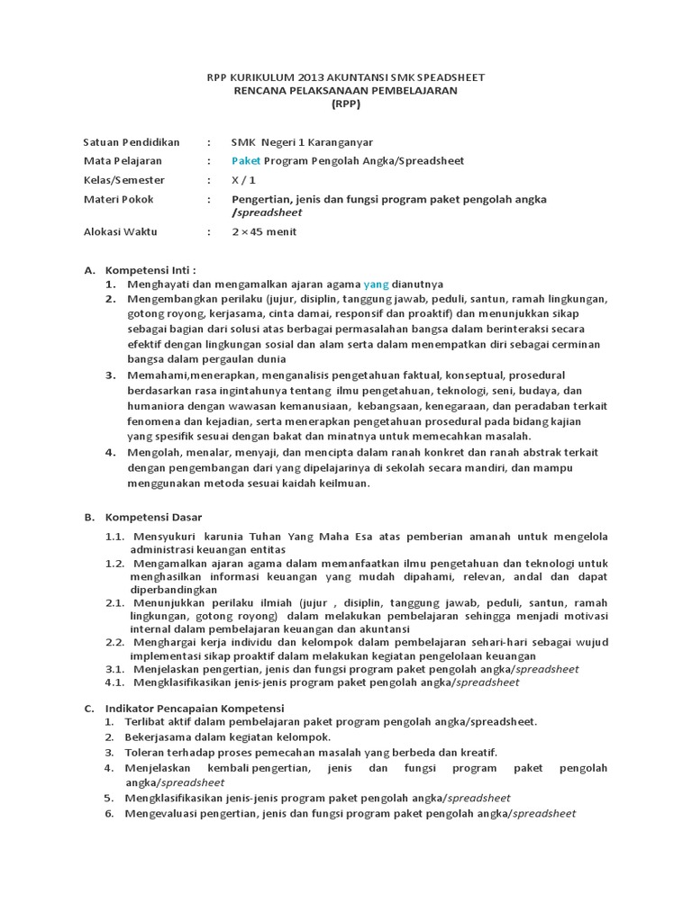 Rpp kurikulum 2013 kelas 2 sd semester 2 t.p 2018/2019. Download rpp aplikasi pengolah angka spreadsheet smk kelas x kurikulum 2013 revisi 2017 2018 semester 1 dan 2 jurusan akuntansi dan keuangan lembaga. Rpp spreadsheet smk akuntansi kurikulum 2013 semester 2 doc guru. ← administrasi guru ppkn smk kurikulum 2013. Standar operasional prosedur (sop) paket program pengolah angka/ spreadsheet alokasi waktu.